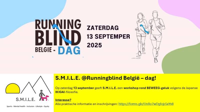 Op zaterdag 13 september wordt de allereerste Running Blind België-dag in Gentbrugge georganiseerd. Een verbindende dag vol beweging, ontmoeting en inspiratie. Er zal samen de natuur ingetrokken worden, verhalen en ervaringen zullen gedeeld worden en je zal kunnen genieten van workshops, sport, en gezelligheid.