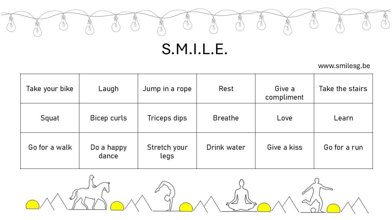 Je kan alvast positief en beweegvriendelijk feesten met het S.M.I.L.E. dieet (doc. kaart2026). Een gezonde mix van positieve (beweeg)momenten.